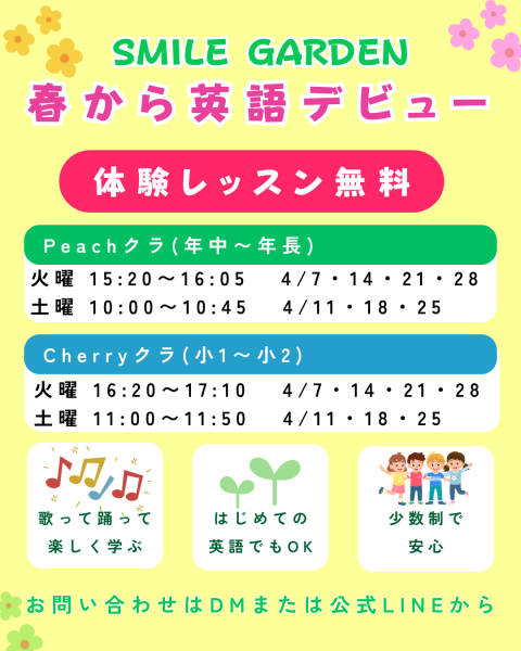 📢【4月スタート!無料体験レッスン受付中🌸】新しい季節、新しいチャレンジにぴったりの4月✨Smile Gardenでは4月スタートの生徒さんを募集しています😊初めての英語でも大丈夫!「楽しい!」から始まるレッスンです🌱🎵 歌って踊って楽しく学ぶ🌱 はじめての英語でもOK👨👩👧👦 少人数制で安心【4月 無料体験レッスン】🍑 Peachクラス(年中〜年長)🔸 火曜日 15:20〜16:05 4/7・4/14・4/21・4/28🔸 土曜日 10:00〜10:45 4/11・4/18・4/25🍒 Cherryクラス(小1〜小2)🔸 火曜日 16:20〜17:10 4/7・4/14・4/21・4/28🔸 土曜日 11:00〜11:50 4/11・4/18・4/25✨ 4月はスタートに最適なタイミング!✨ 初回月からの体験レッスンも大歓迎です!「英語を好きになる第一歩」を一緒に踏み出しませんか?😊お問い合わせはDMまたは公式LINEから📩#SmileGarden #子ども英会話 #尾張旭 #瀬戸 #長久手 #無料体験レッスン #幼児英語 #小学生英語 #春から英語 #4月スタート