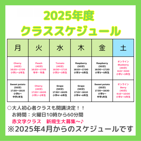 2025年度4月からのレッスンスケジュールが決まりました!新年度の入会受付スタートします😊4月より幼児クラスリニューアル!新年中さんより入会していただけます♪⭐︎幼児クラス火曜日16時20分〜17時05分⭐︎新小1〜小2クラス月曜日16時20分〜17時05分⭐︎火曜日17時20分〜18時05分⭐︎新小2〜小3クラス水曜日16時30分〜17時15分🌱オンラインレッスン⭐︎低学年の部土曜日8時15分〜9時00分⭐︎高学年の部土曜日9時15分〜10時00分