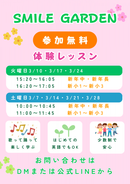 📣【3月の無料体験レッスンのご案内🌸】3月に入りましたね😊少しずつ春のぬくもりを感じる季節になりました。Smile Gardenでは春の体験レッスンがスタートしています🌷たくさんのお問い合わせ・ご入会、本当にありがとうございます✨歌って踊って楽しく学ぶ英語レッスン🌈はじめての英語でも大丈夫です。少人数制で安心してご参加いただけます😊📅【3月体験日程】🔸火曜日 3/10・3/17・3/2415:20〜16:05 新年中・新年長16:20〜17:05 新小1〜新小3🔸土曜日 3/7・3/14・3/21・3/2810:00〜10:45 新年中・新年長11:00〜11:45 新小1〜新小3まずは教室の雰囲気を感じにいらしてくださいね😊ご希望の方は「体験希望」とメッセージをお送りください🌷お会いできることを楽しみにしております🌸